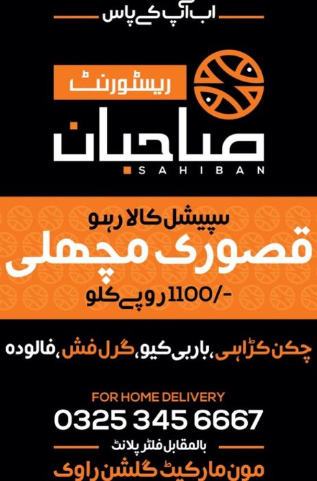 Welcome to Sahiban Restaurant, your culinary haven in Moon Market, Gulshan-e-Ravi, Lahore. Renowned for our seasonal specialties, we bring you the irresistible Qasoori Special Masala Fish Fry, a must-try during winter, and the refreshing Qasoori Special Falooda, perfect for summer indulgence. At Sahiban, we pride ourselves on serving authentic flavors in a warm, inviting atmosphere. Join us for a delightful dining experience that celebrates the best of Lahore's rich culinary heritage!